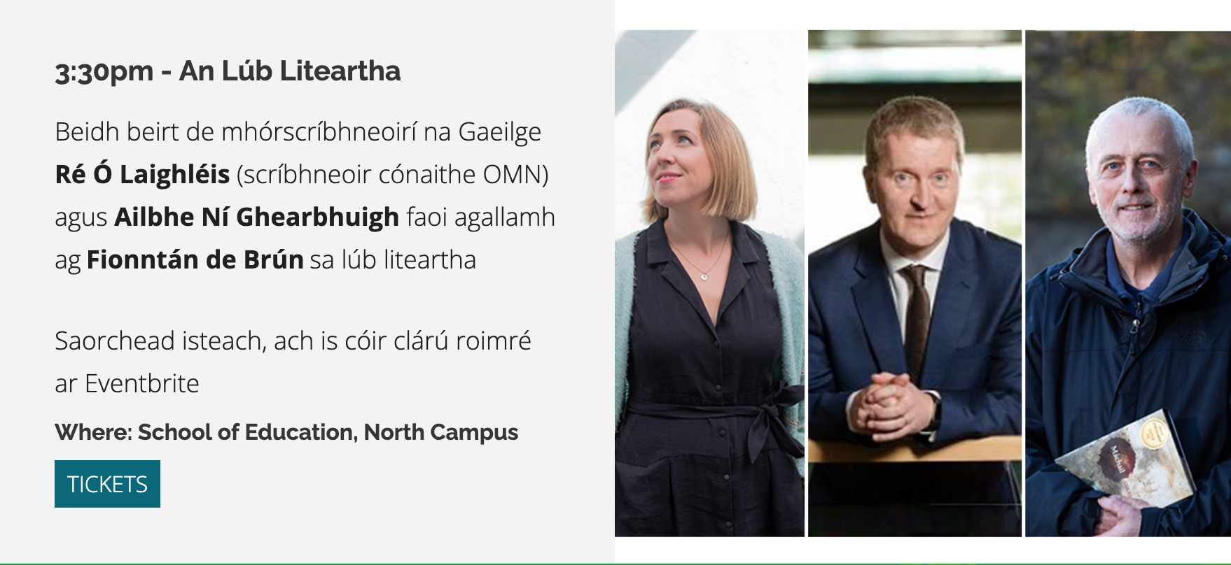 Ag tnúth go mór leis an ócáid seo i dteannta Ré Uí Laighléis agus Fhionntáin de Brún. Is féidir ticéad a chur in áirithe saor in aisce ag an nasc seo.