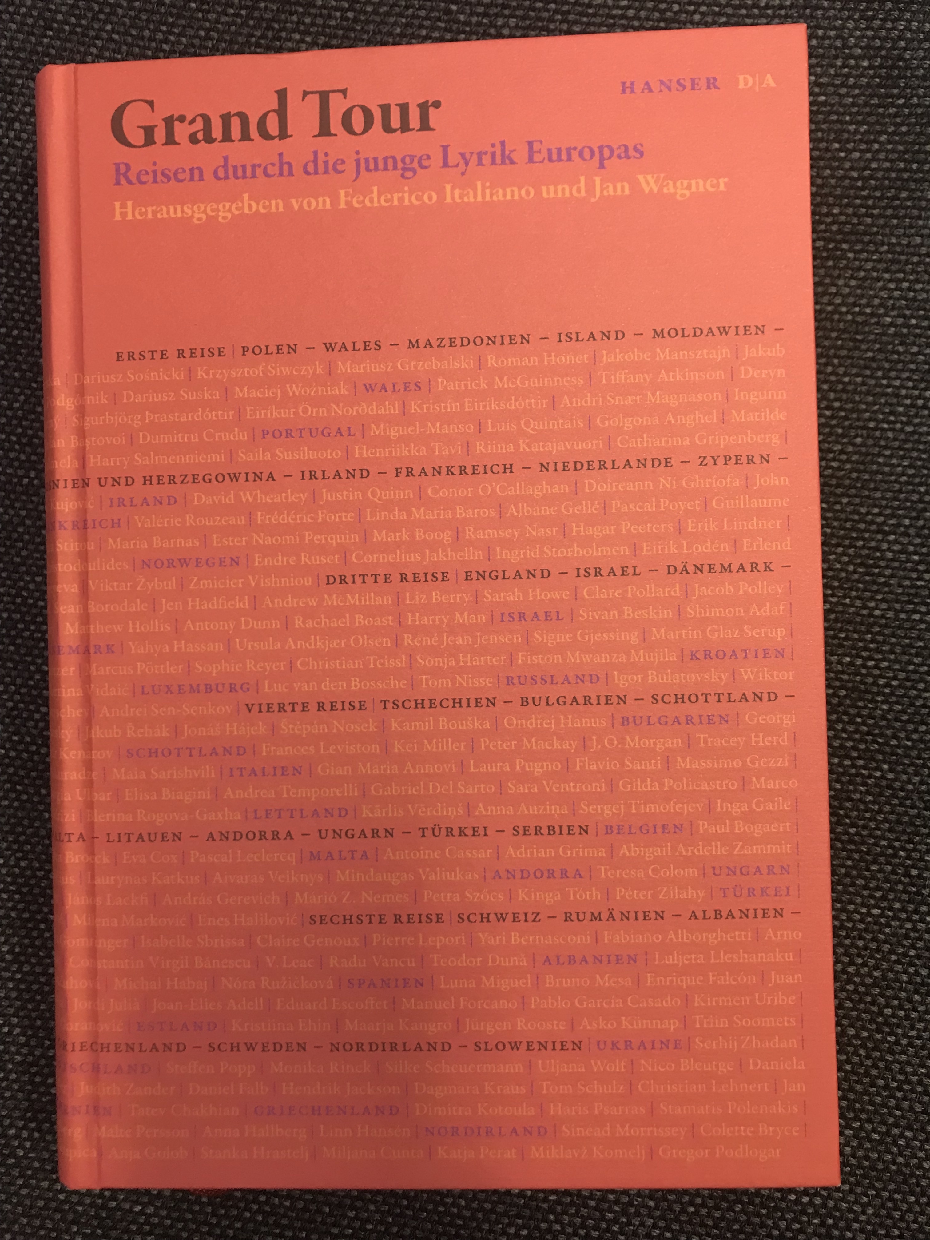 Great to receive a copy of this anthology during the week, edited by Federico Italiano and Jan Wagner, containing German translations of my work, alongside many, many poets whom I greatly admire. Among the Irish contingent are Ailbhe Darcy, Alan Gillis, Victoria Kennefick, Nick Laird, John McAuliffe, Sinéad Morrissey, Doireann Ní Ghríofa, Leanne O’Sullivan, Justin Quinn and David Wheatley. This book is divided into various ‘itineraries’, taking in Poland, Wales, Macedonia, Iceland Moldova, Portugal and Finland; another begins in Bosnia and Herzegovina, Ireland, France, the Netherlands, Cyprus, Norway and Belarus; the third journey takes us from England to Israel, Denmark, Austria, Croatia, Luxembourg and Russia; the fourth leg includes poets from Chechnya, Bulgaria, Scotland, Georgia, Italy, Kosovo and Latvia; the fifth itinerary takes in Belgium, Malta, Lithuania, Andorra, Hungary, Turkey and Serbia; the sixth trip begins in Switzerland before taking us to Romania, Albania, Slovakia, Spain, Montenegro and Estonia; the seventh and final trek take us from Ukraine to Germany, Armenia, Greenland, Sweden, Northern Ireland and Slovenia. These are poignant -and vital – poetic journeys, given what the scenes that are emerging from Ukraine in recent days and weeks…